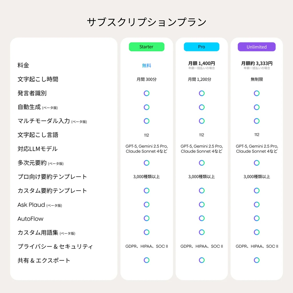 PLAUD NOTEの利用には、本体価格とは別に、AI機能(文字起こし・要約など)を利用するためのサブスクリプションプランが必要です。