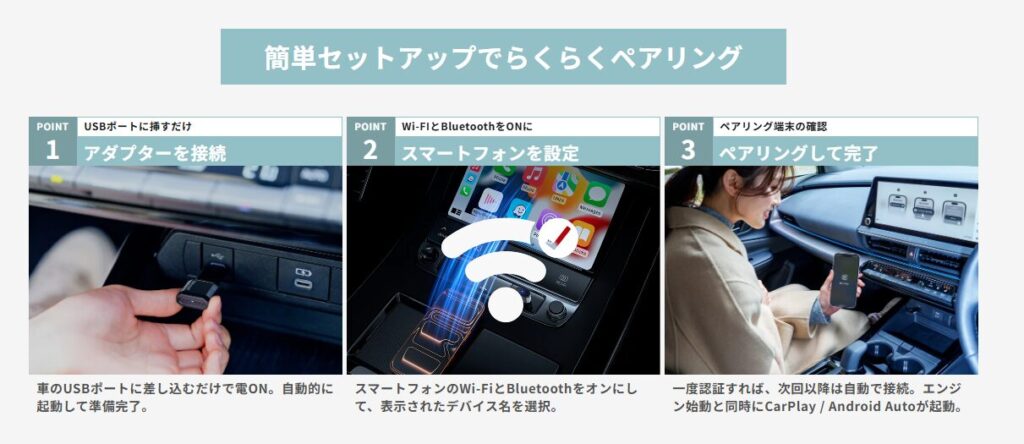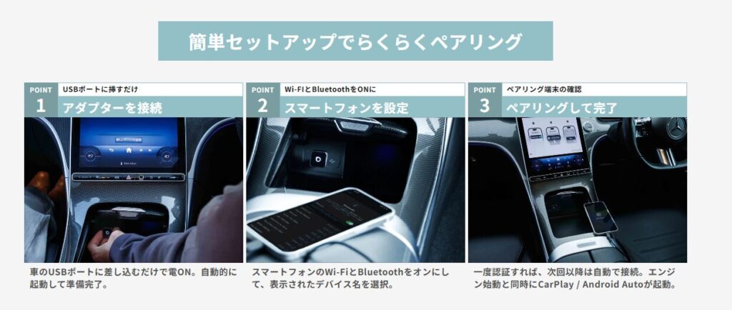 どちらもポートに挿しておけば、エンジン始動と共に即座に立ち上がり、CarPlay/Androidautoが無線で立ち上がります。
